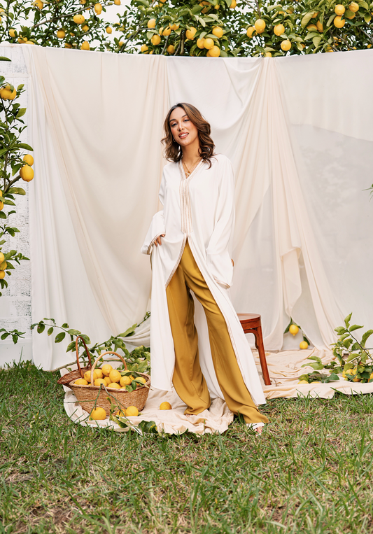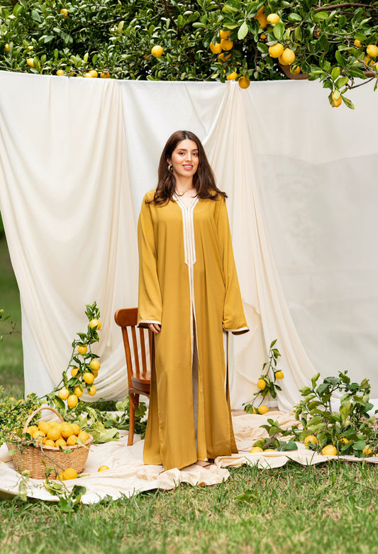 DJELLABA À POCHE MOUTARDE GALON DORÉ TRESSE