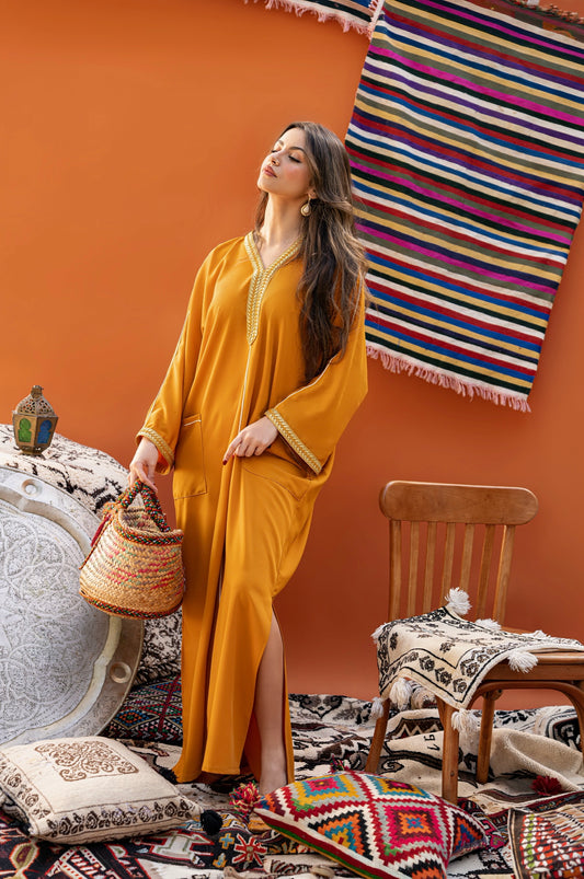 DJELLABA À POCHE MOUTARDE GALON DORÉ