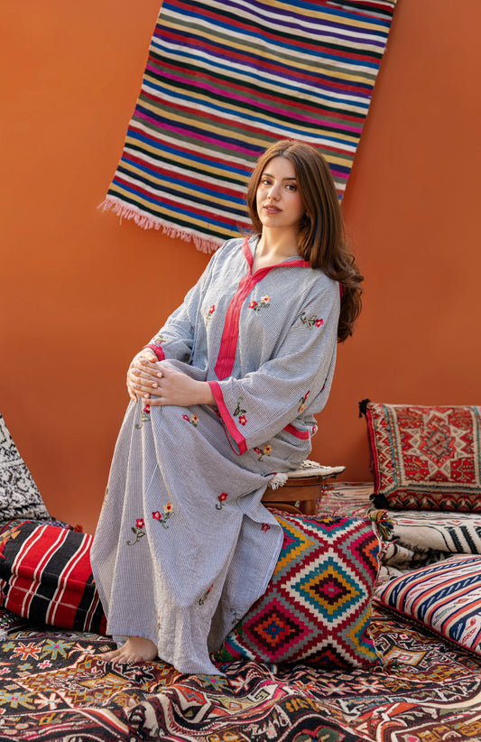 DJELLABA EN LIN À CAPUCHE A FLEURS