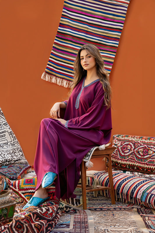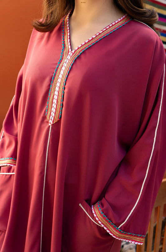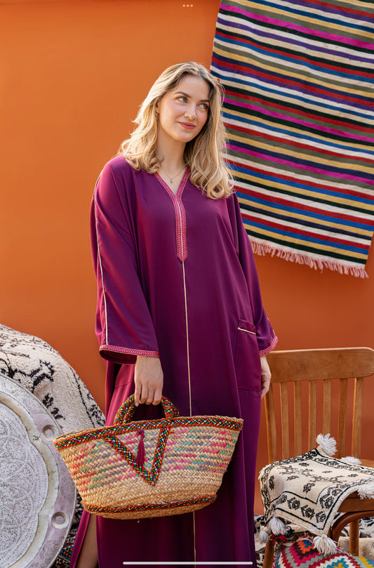 DJELLABA À POCHE PRUNE GALON ROSE