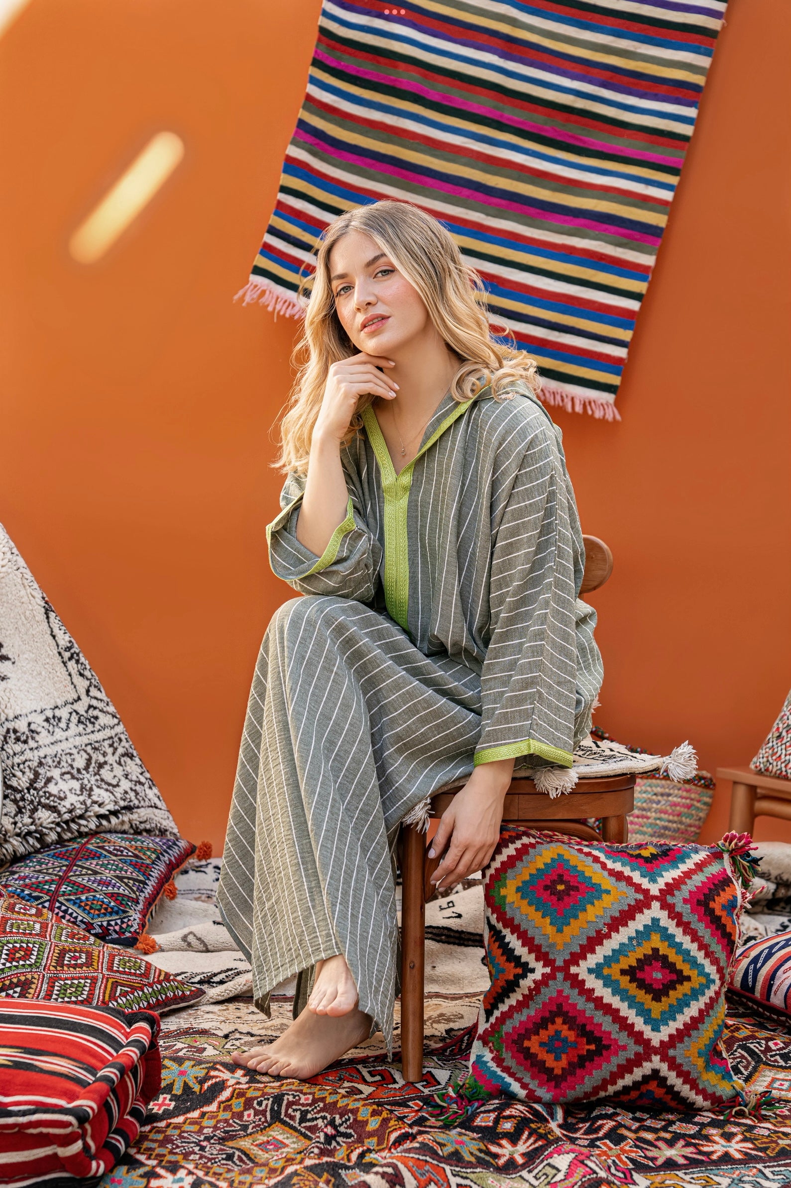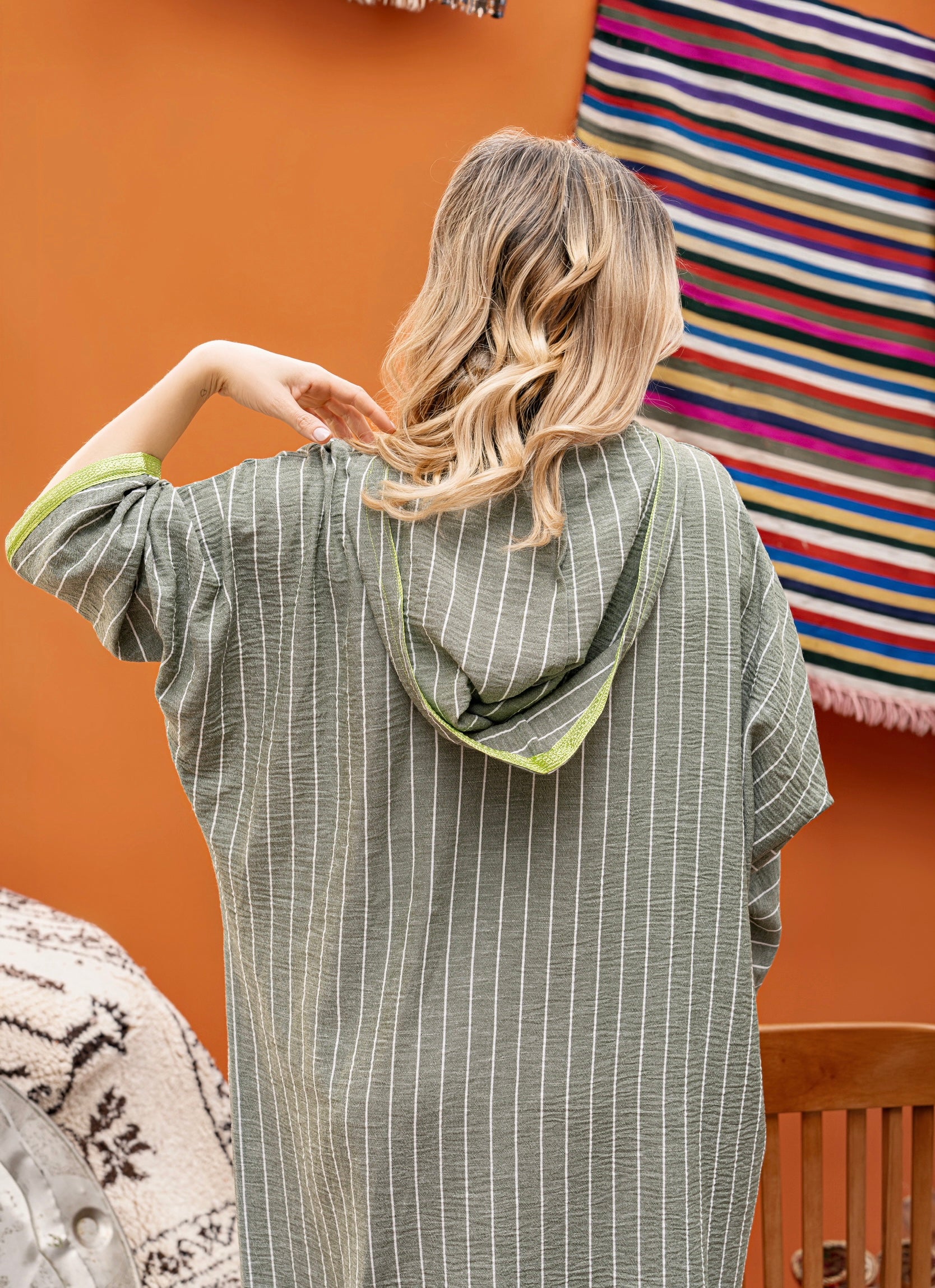 Djellaba en lin avec des poches plaquées et détails au niveau du col et poignets, fentes latérales et capuche.
