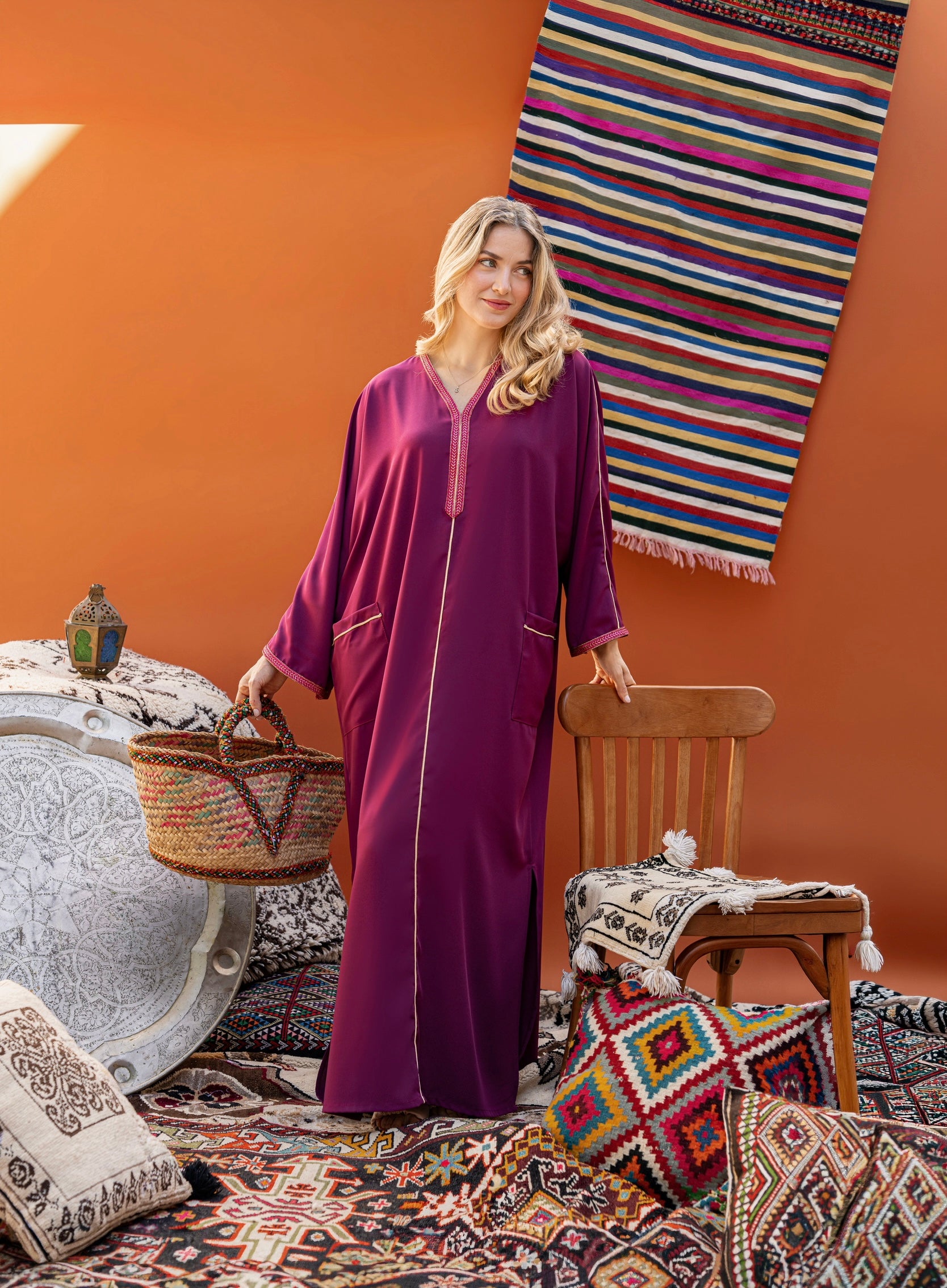 Djellaba à galon et poches pratiques, idéale pour un look à la fois raffiné et décontracté.