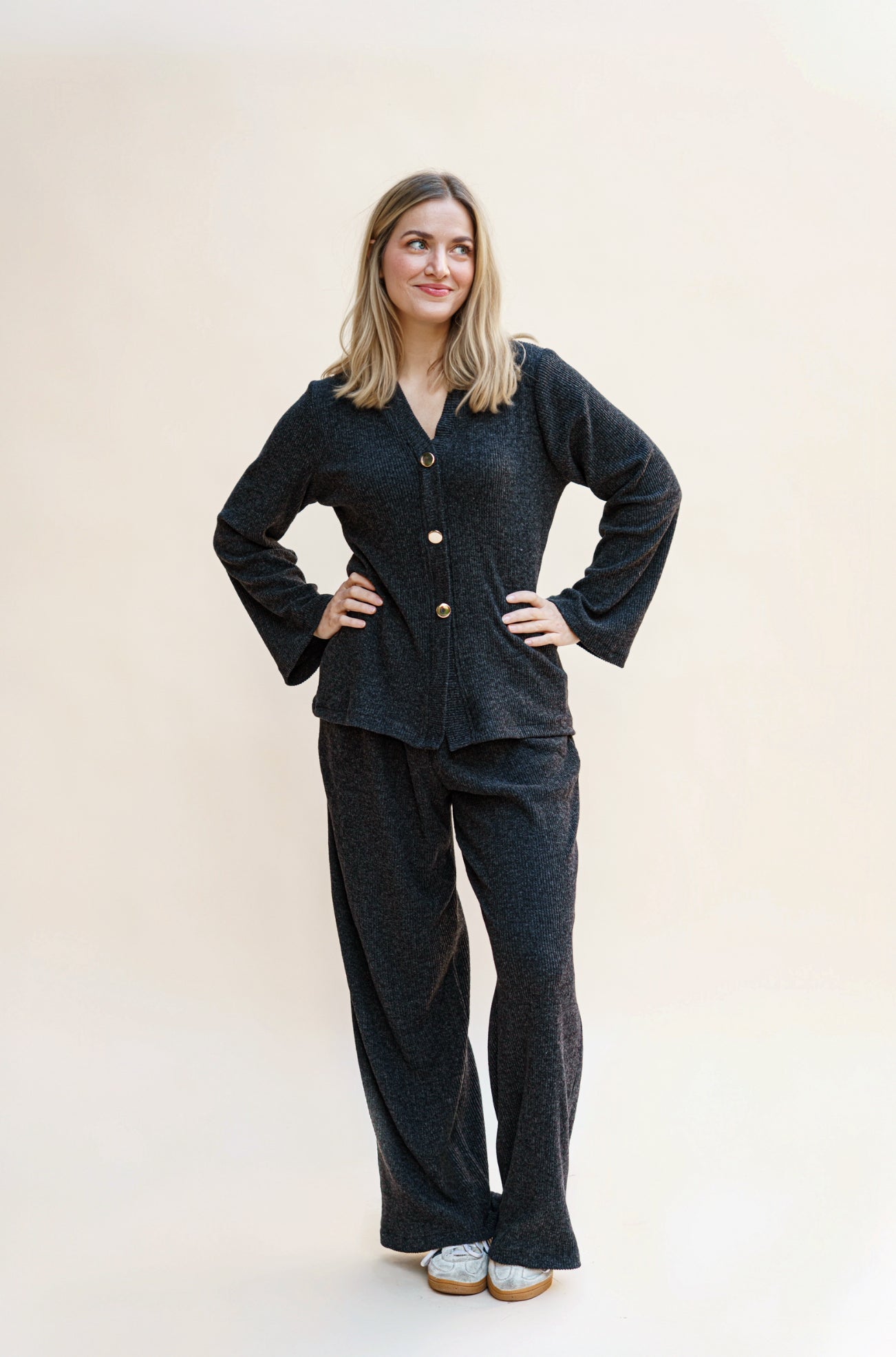 Ensemble en tissu côtelé avec boutons dorés, manches évasées et pantalon droit. Un look chic et moderne,  alliant élégance et confort au quotidien.