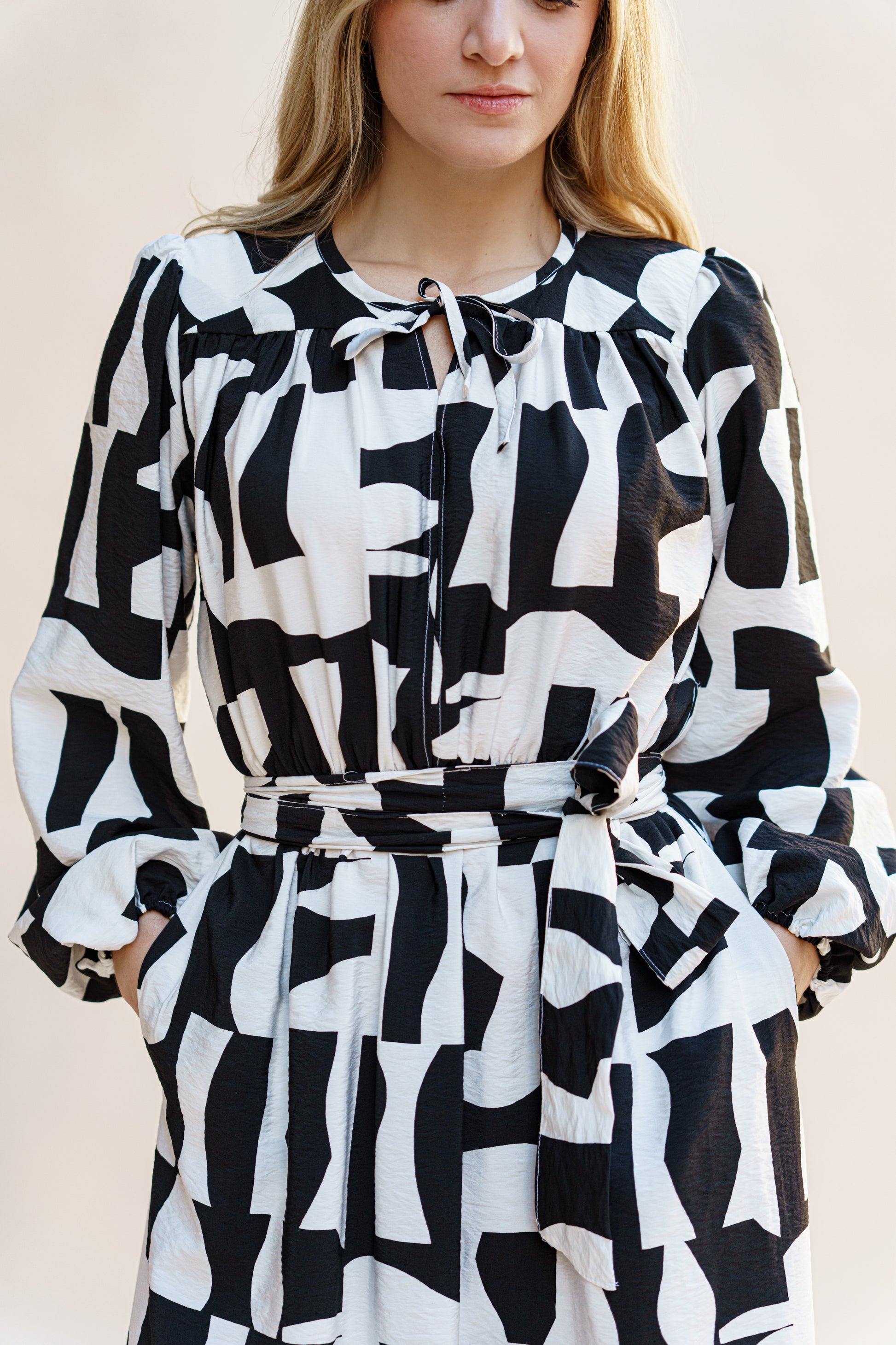 Robe longue en jacquard avec empiècement aux épaules, nœud a l'avant et ouverture centrale, poches latérales, manches évasées et jupe longue. Tissu jacquard confortable et élégant, parfait pour un style féminin et raffiné .
